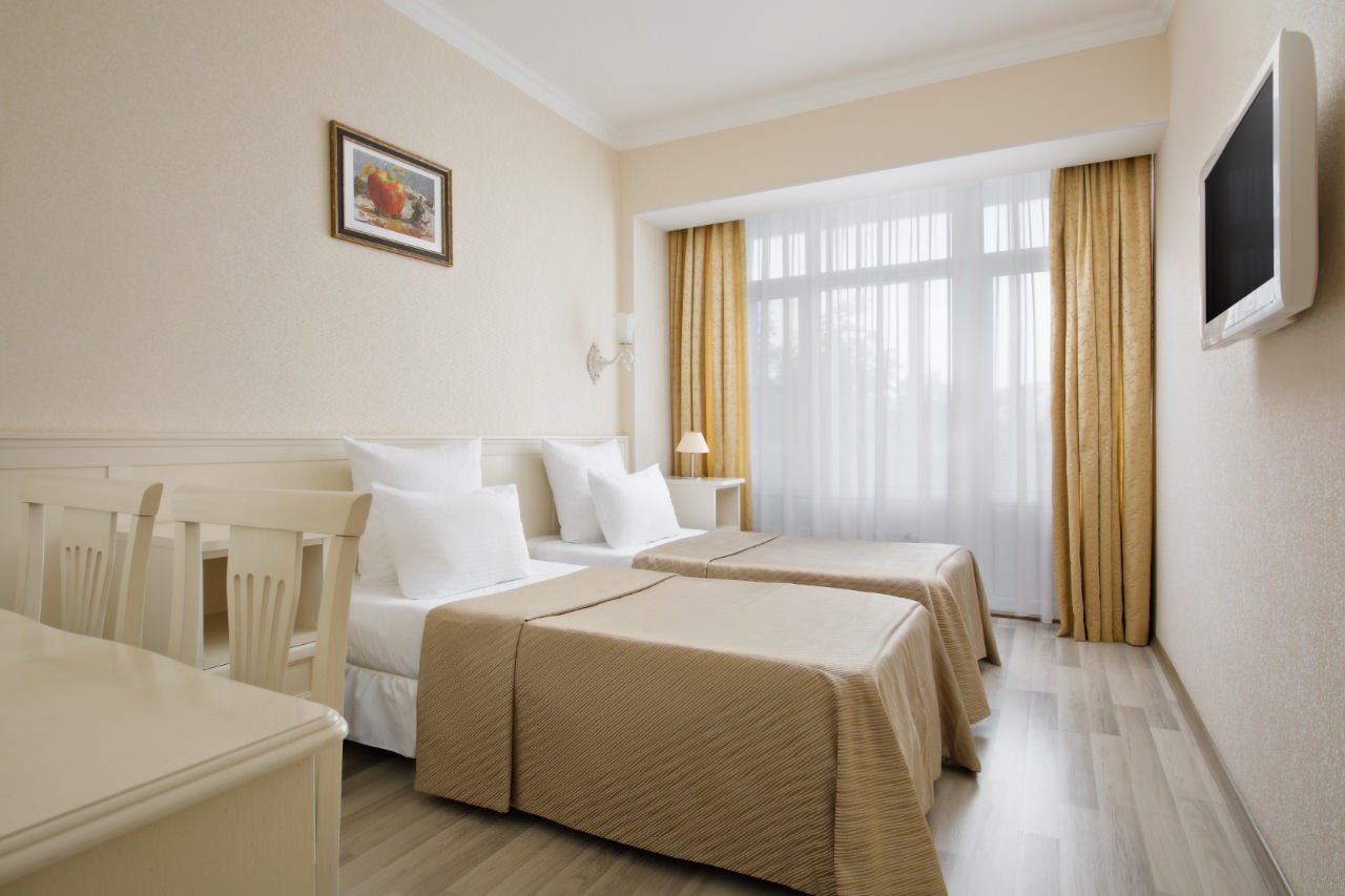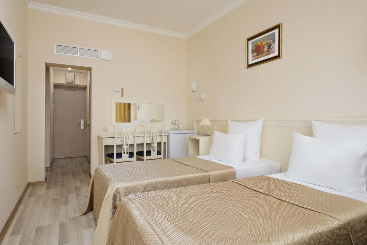 Площадь номера 14 кв.м. Вместимость до 3 мест. Один ребёнок до 7 лет — можно без отдельного спального места.